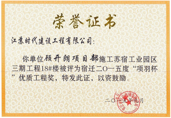 近日,蘇宿園區(qū)公舍三期18#白領(lǐng)公寓工程被宿遷市住房和城鄉(xiāng)建設(shè)局授予“項(xiàng)羽杯”優(yōu)質(zhì)工程獎(jiǎng)。